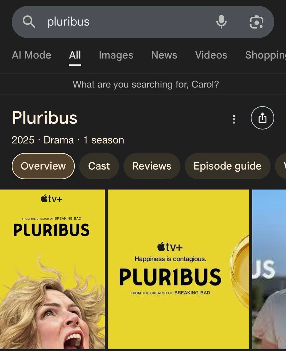 El cursor parpadea en el campo de búsqueda de Google. Millones de personas escriben la misma palabra cada día: Pluribus. La mayoría busca información sobre la serie más comentada de 2025, el regreso triunfal de Vince Gilligan a la televisión. Pero lo que encuentran no es solo una lista de resultados. Debajo de la barra de búsqueda, deslizándose desde la derecha como un susurro digital, aparece una frase que eriza la piel: "What are you searching for, Carol?"